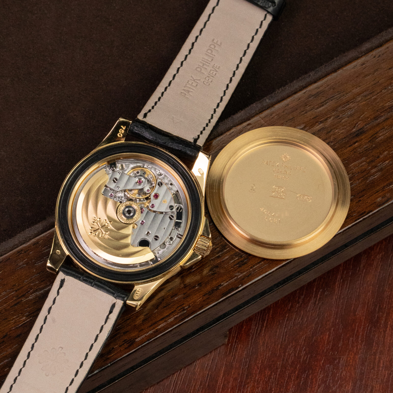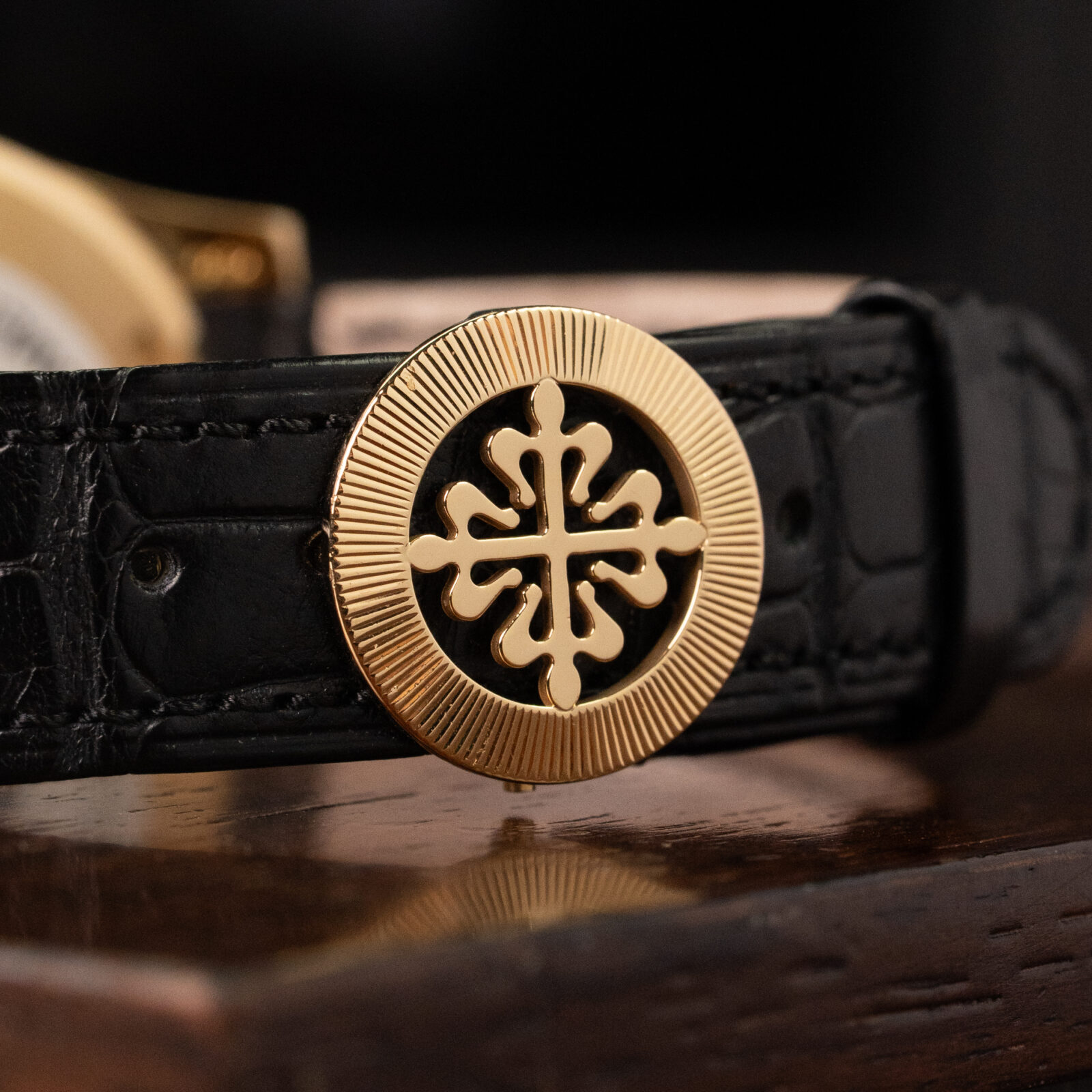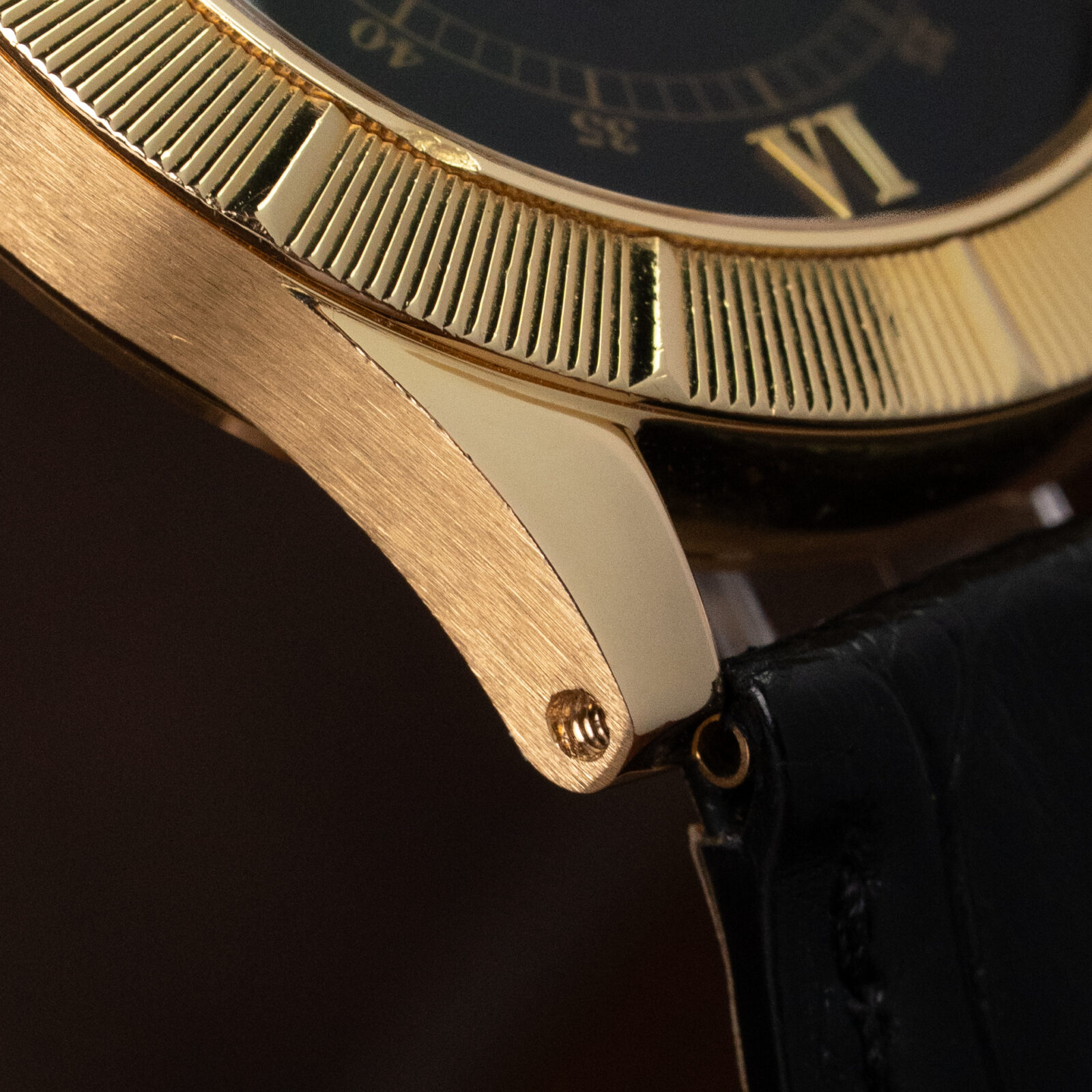 The upside, of course, is that the Neptune can still be picked up for a reasonable price while prices of the Aquanaut have gone through the roof in recent years. This reference 5081J from 2001 features a 36.5 mm yellow-gold case and a contrasting nlack dial. The dial sports a closed painted minute track in the centre with 5 minute indications on the outside and large applied 18k yellow-gold Roman numerals at the quarter positions. The dial’s elegant looks are complemented by large leaf hands and a discrete date window at the 3 o’clock position. The watch runs on a handy automatic movement and comes on a black alligator-leather Patek Philippe strap with a special 18k yellow-gold folding clasp that mimics the look of the bezel. The watch comes with recent Patek service papers and extract of the archives.