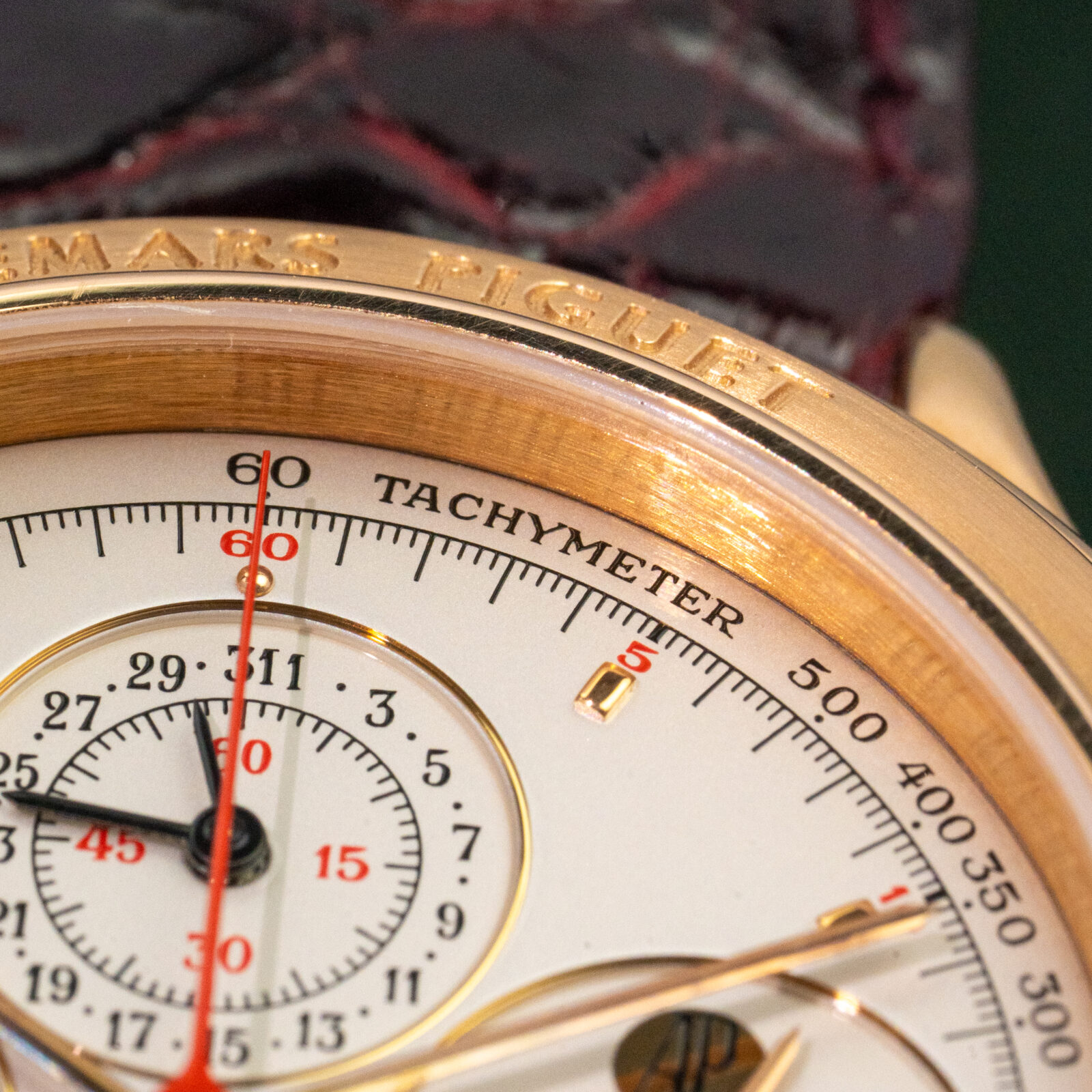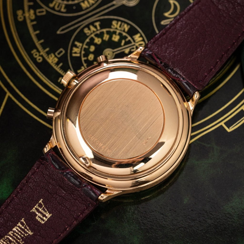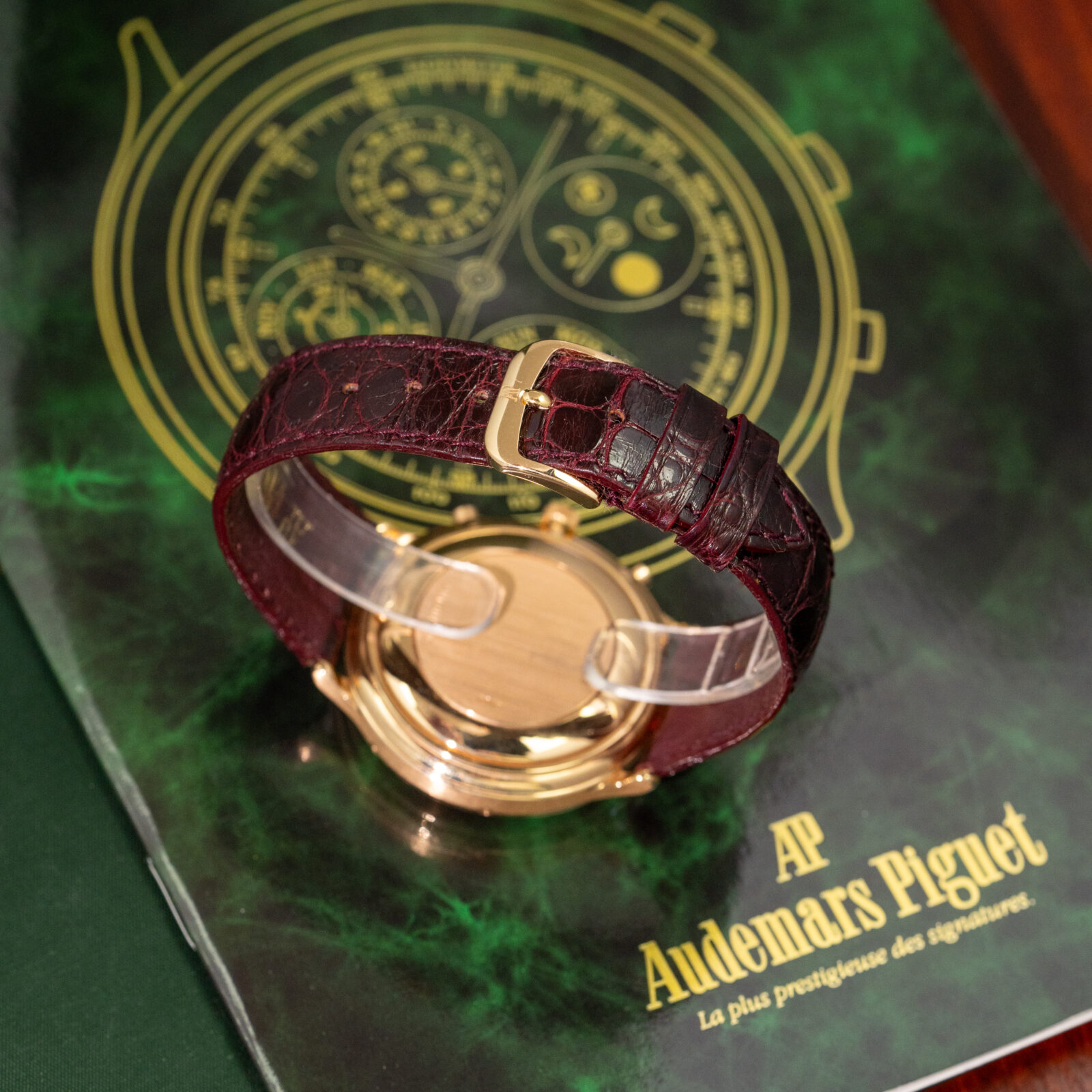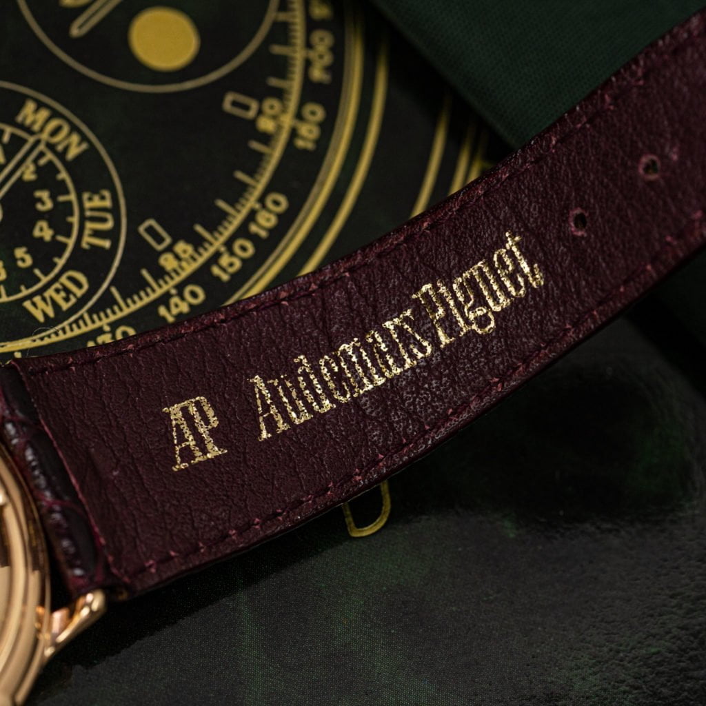 This 25695OR dates back to 1993 and comes as a full set with the papers booklets, and the original wooden box, which doubles as a winder for the automatic movement. The watch is delivered on a burgundy alligator-leather Audemars Piguet strap with an 18k rose-gold “AP”-signed Ardillon buckle.