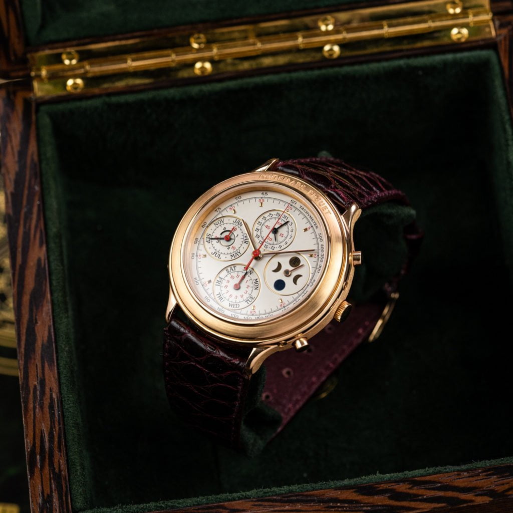 Audemars Piguet’s Huitième line heralded the arrival of the modern watchmaking era by combining the classic perpetual calendar chronograph aesthetic with an oversized case and an automatic movement.