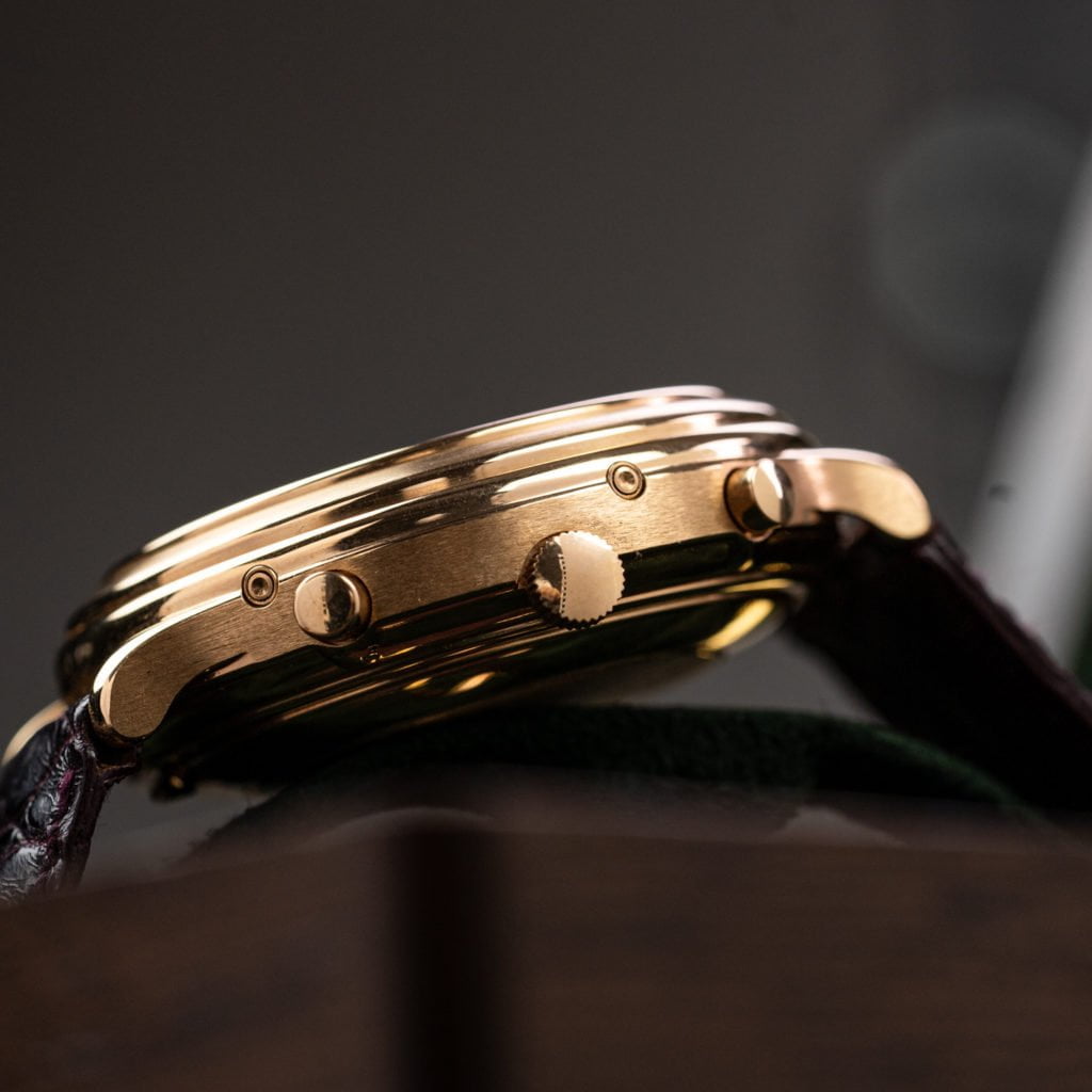 The dial, on the other hand, invokes classic mid-century watchmaking cues. The soft opaline backdrop sports four recessed chronograph sub dials with pink gold surrounds and elegant printed serif lettering. The serif lettering is also found on the traditional tachymetric scale on the edge of the dial. The elegant look of the dial is complemented by the implementation of thin 18k rose-gold hands (and a bright red central chronograph hand) and small applied rose-gold hour markers.