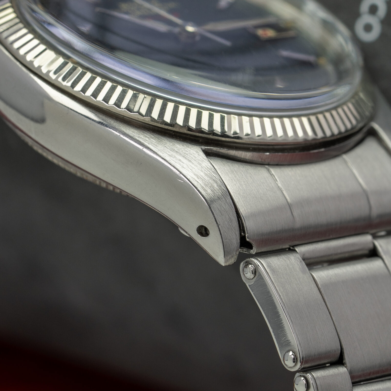The first were ushered in under two references, depending on the bezel finish, it was either a 6304 or 6305. The first mentioned is more uncommon to encounter and had a smooth-finished, slightly domed bezel. The 6305 can be divided in two series. Initially a white-gold milled bezel was applied to the case. These are more finely fluted than the later bezels from the 16xx series onwards, and therefore are known as “coin-edge”. The case itself measures a perfect 36mm and is preserved in immaculate state. Due to the domed caseback, these so-called “Ovettone” sit a bit higher on the wrist. The lug-width is 20mm and in one find the riveted Oyster with expandable links.