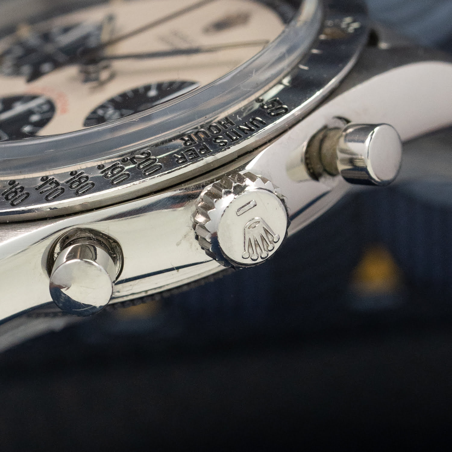 One of the most distinguishing features of this Rolex Daytona is its iconic "Paul Newman" dial. Introduced in 1963; but they were not exactly flying off the shelves. Two years later Rolex introduced an extra dial option with some art-deco design features and an overall different look, dubbed by Rolex 'Exotic dial'; but obviously better known for its unofficial nickname.