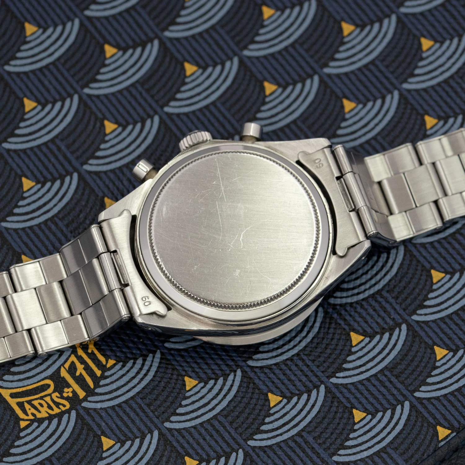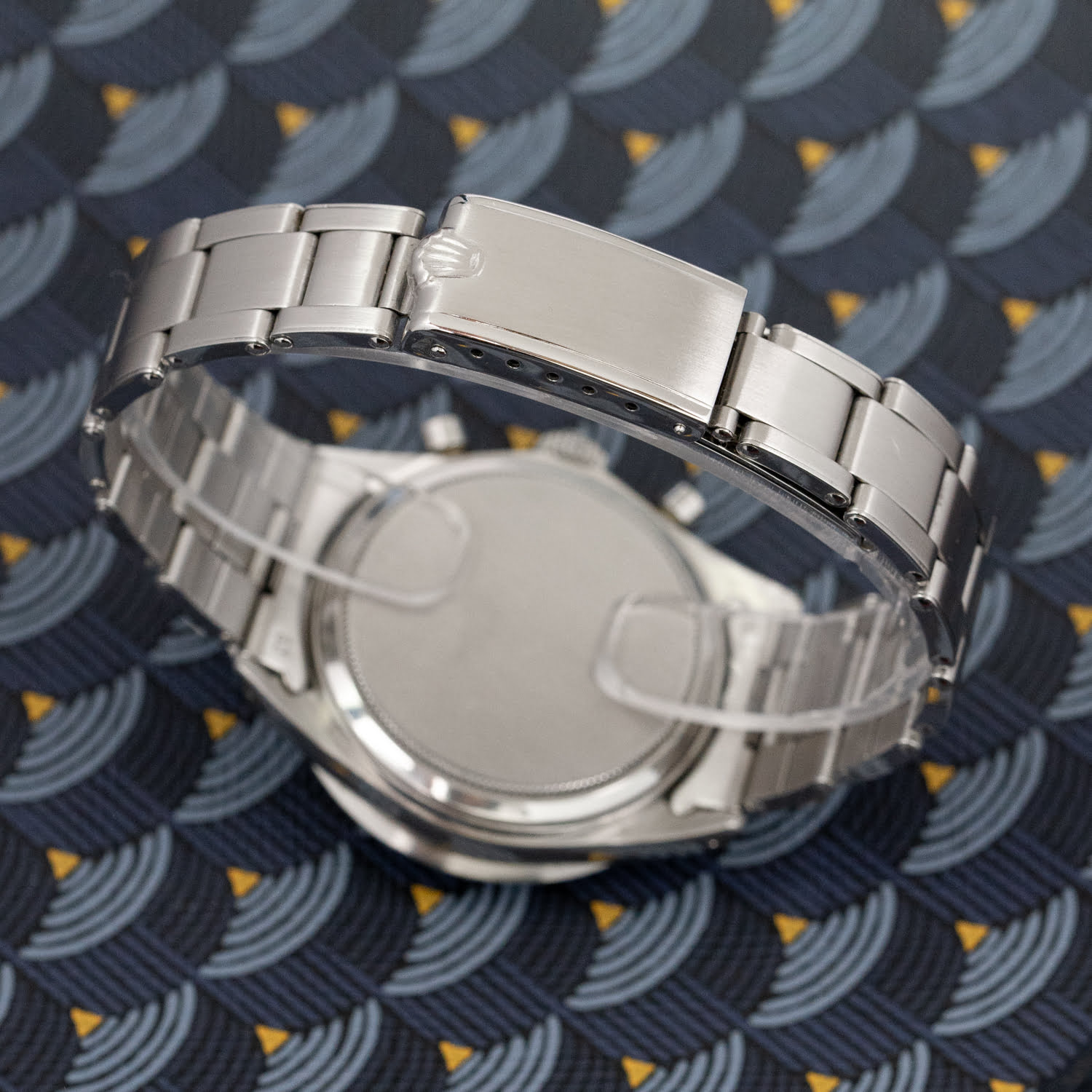 Crafted in a bygone era, this Rolex Daytona Reference 6262 from 1970 has gracefully withstood the test of time. Its condition, for its age, is an ode to the meticulous care and reverence it has received over the years. Every facet of this watch has been preserved with utmost devotion, allowing it to retain its charm and functionality. This particular dial has a subtle, barely noticeable stripe between the 9 and 6 o'clock subdials. However most importantly the tritium lume-plots are perfectly intact, original and creamy colored, matching to the hands precisely. The riveted Oyster bracelet 7205 is stamped from the same year, 1970.