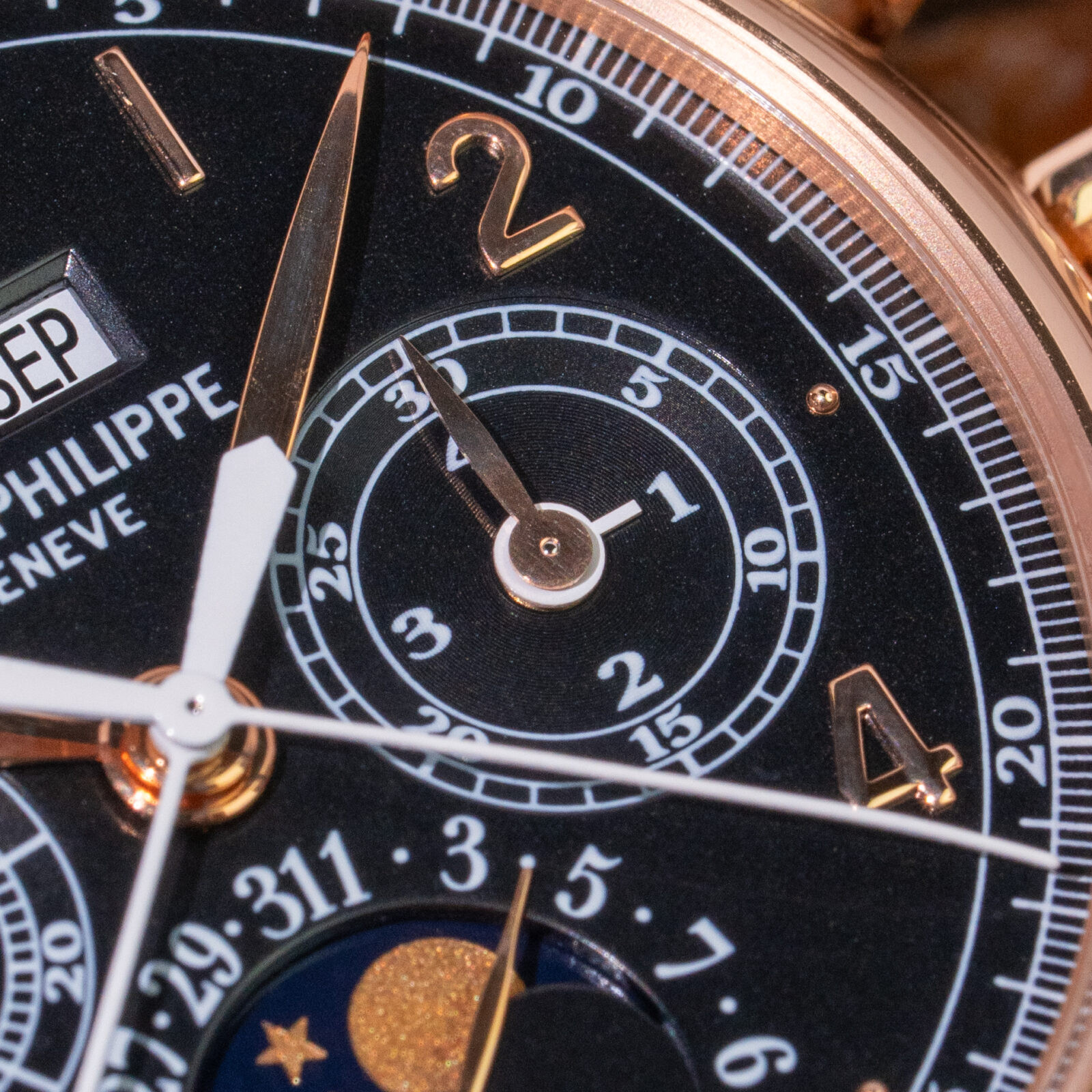 The elegant dark dial sports applied Arabic indices and feuille (leaf) hands as a nod to the ref. 1518 and early 2499s perpetual calendar chronographs. Two apertures at the 12 o’clock position reveal the day and month mechanism. The dial features three sub-dials. The recessed sub-dial at the 9 o’clock position displays a running seconds as well as a 24-hour hand while the recessed sub-dial at the 3-hour position incorporates a 30-minute chronograph counter and a leap year indicator. Finally on the lower sub-dial we find a charming moon phase indicator, which is surrounded by a date complication.