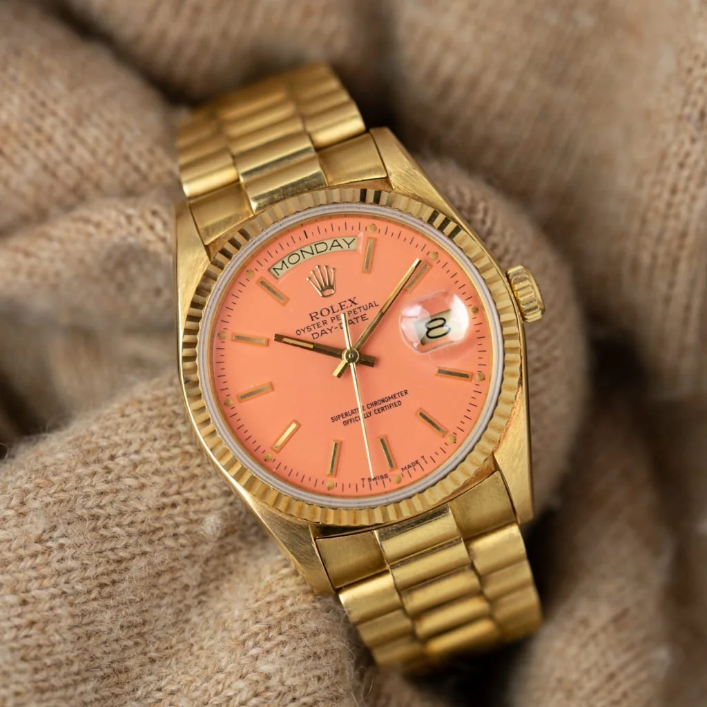A happy accident or maybe hindsight really is 20/20. What it all boils down to is that the outrageously coloured Rolex dials from the 1970s and 1980s are among the most coveted vintage watches nowadays; and it’s not that hard to understand why. During this period Rolex offered bright lacquered dials, with the paint being provided by a company called Stella SA. This option wasn’t particularly popular. After all, you had to be a gentleman (or lady) of considerable means to be able to afford a Day-Date and it was unlikely that a person of that stature would wear a gold watch with such a loud dial. As a result, Stella dials are very scarce and collectible nowadays.