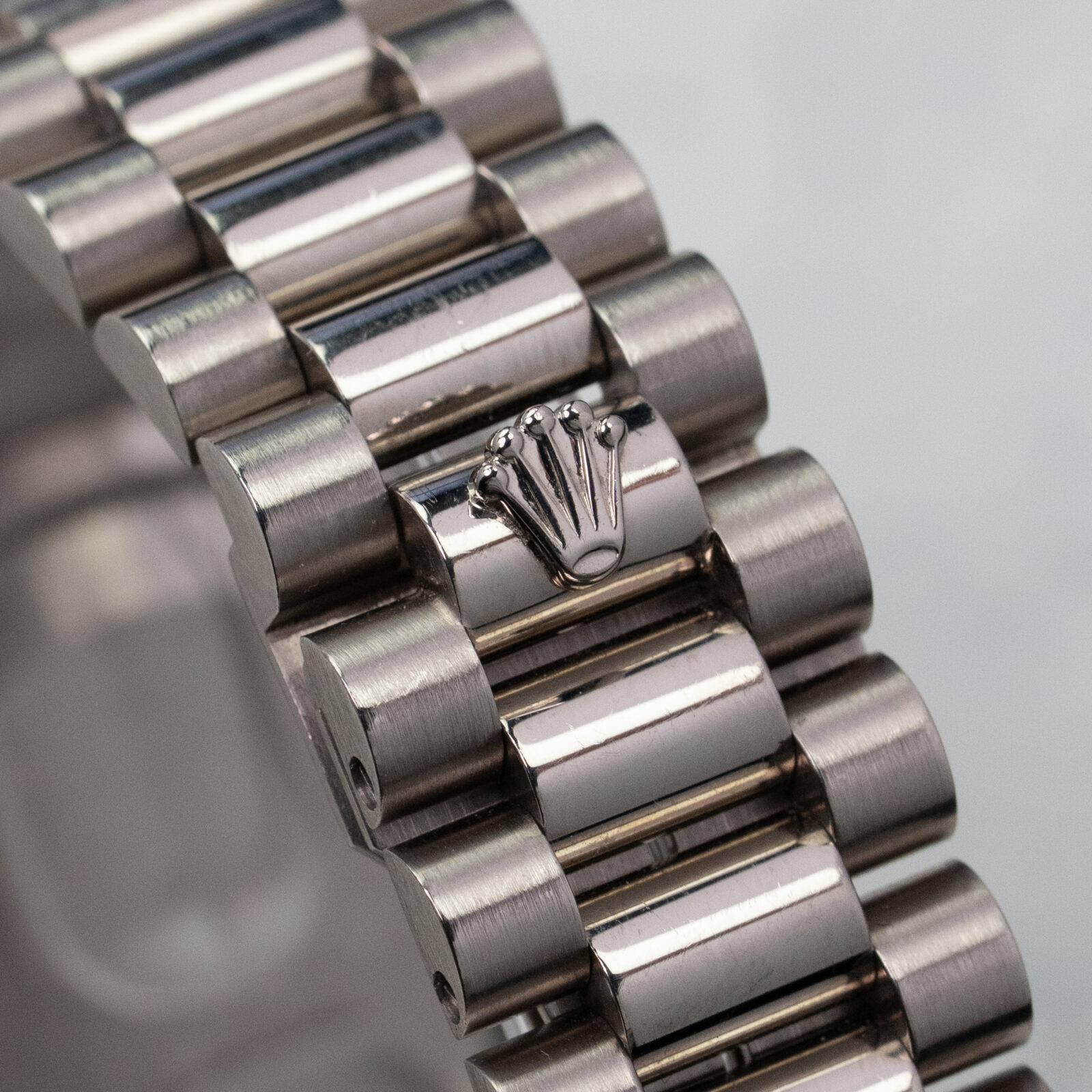 This ref. 18239 combines the 36mm solid white gold case, fluted bezel, matching white gold President bracelet, and classic silvered dial. However, it comes with a bit of "dab of ranch" added to that dial with the inclusion of factory set brilliant-cut hour markers and baguette-cut markers on 6 and 9 o'clock positions.