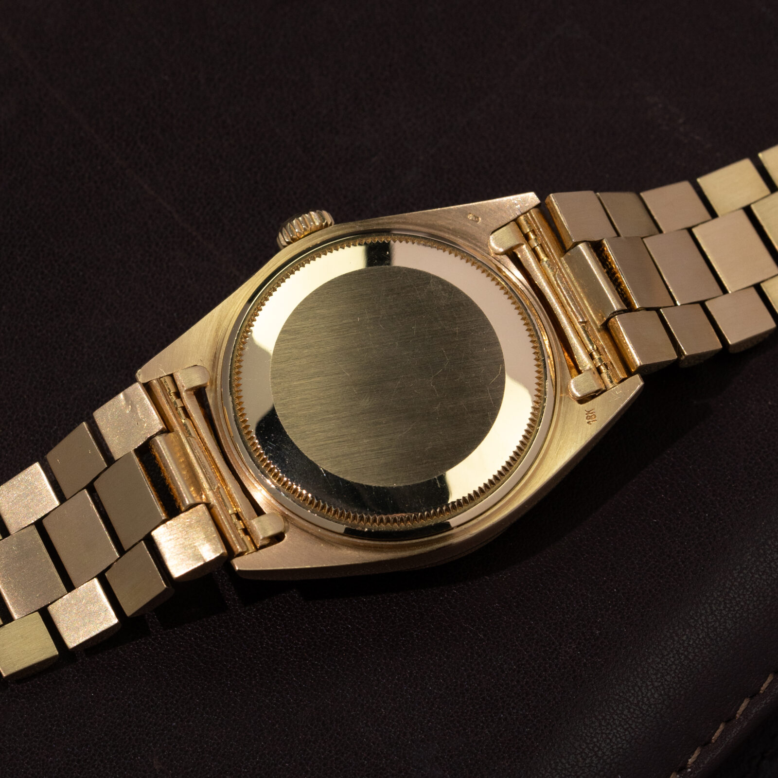 The pie-pan dial (named so because it resembles an upside-down pie-pan) is executed in a lovely silvered color which gives a beautiful contrast to its yellow gold case. This ref. 1811 was produced in 1969 and is still in a great condition, especially considering the fact that it's over 50 years old already. Many Day-Dates from this period that feature special finishes like bark, florentine, and moiré, tend to have lost their lustre due to over polishing.