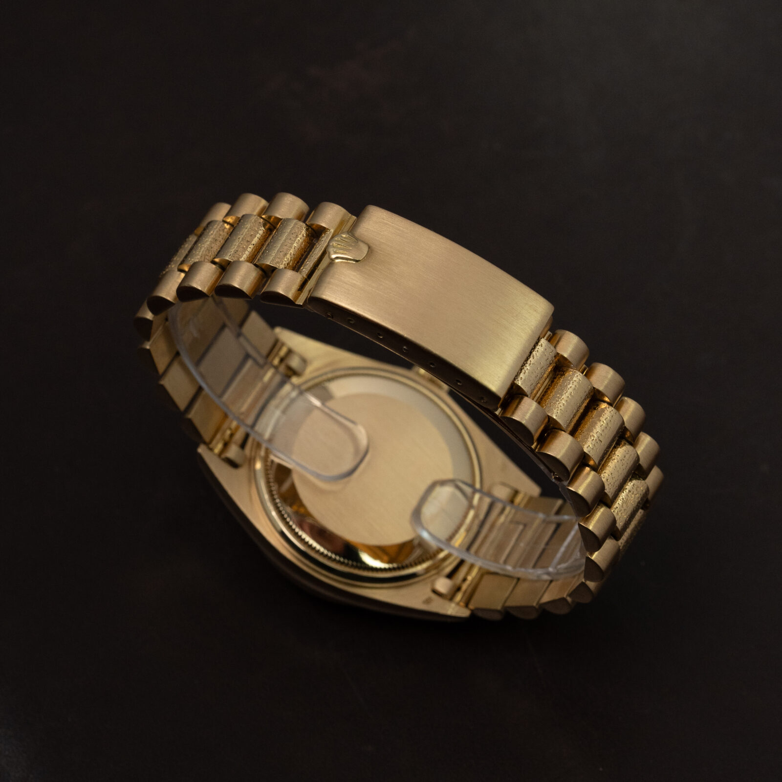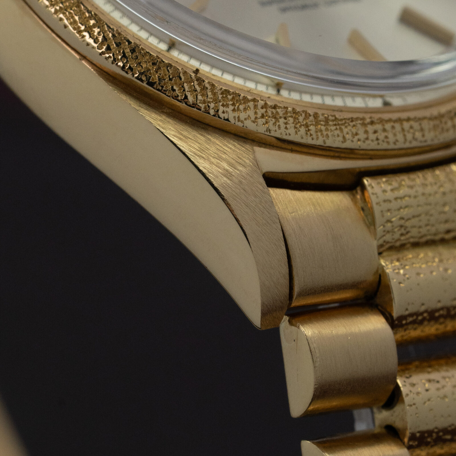 The Day-Date is, of course, best known for its shiny fluted bezel. But many more bezel variations were made, especially in the famed 18xx series from the 1960s and 1970s. The ref. 1811 is one of the more uncommon variants. This watch sports a so-called moiré (also known as morellis) finish on the bezel as well as on the center link of the iconic President bracelet.