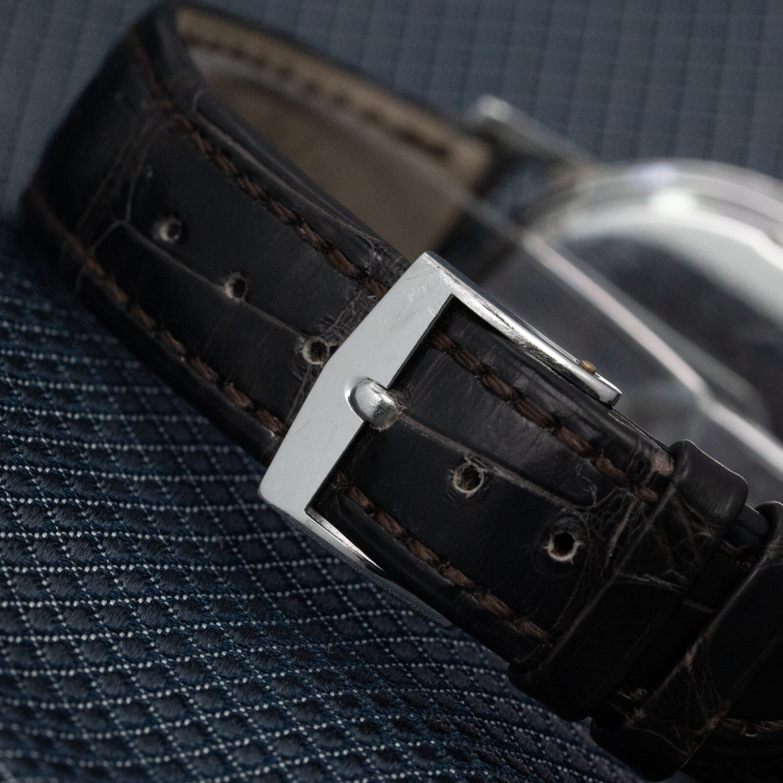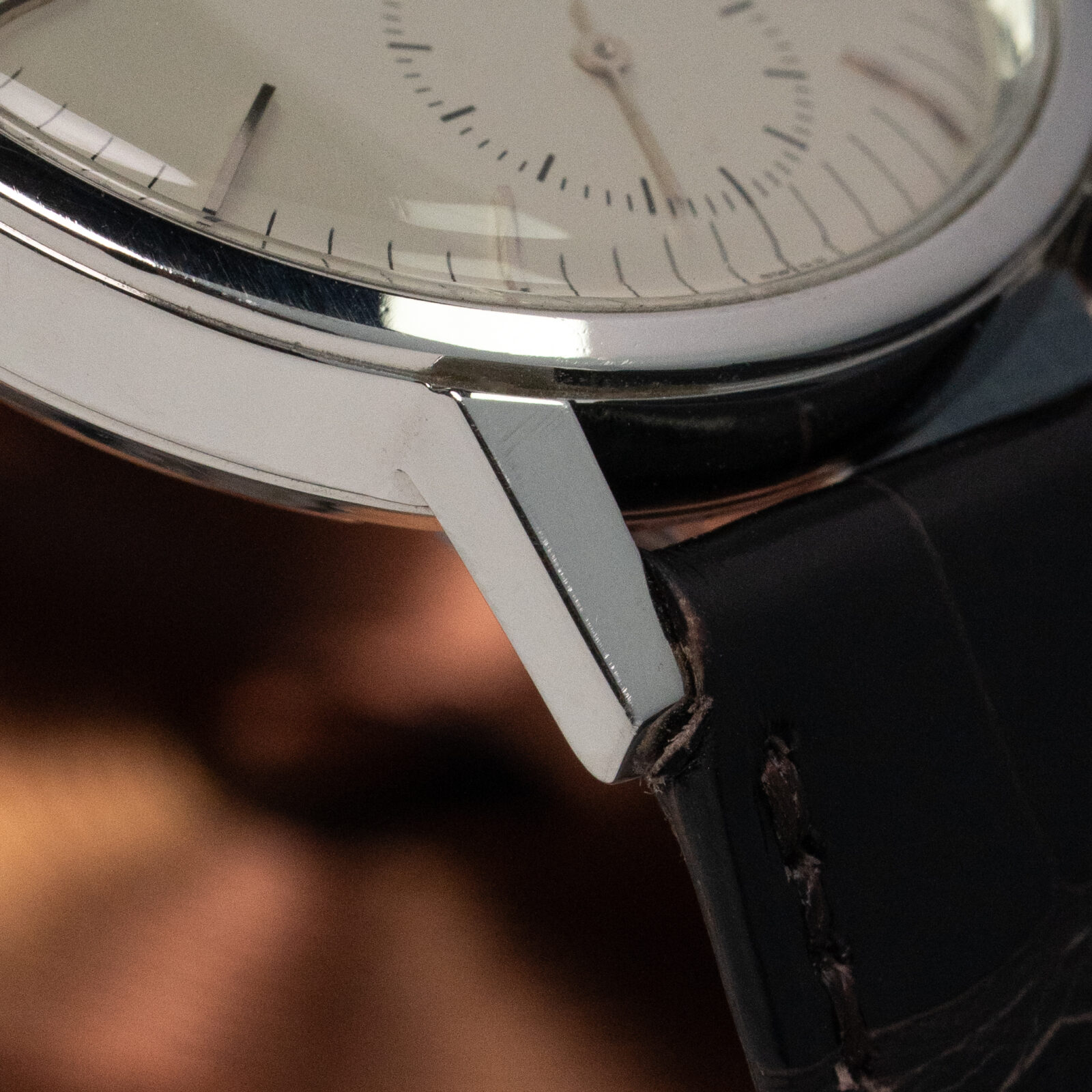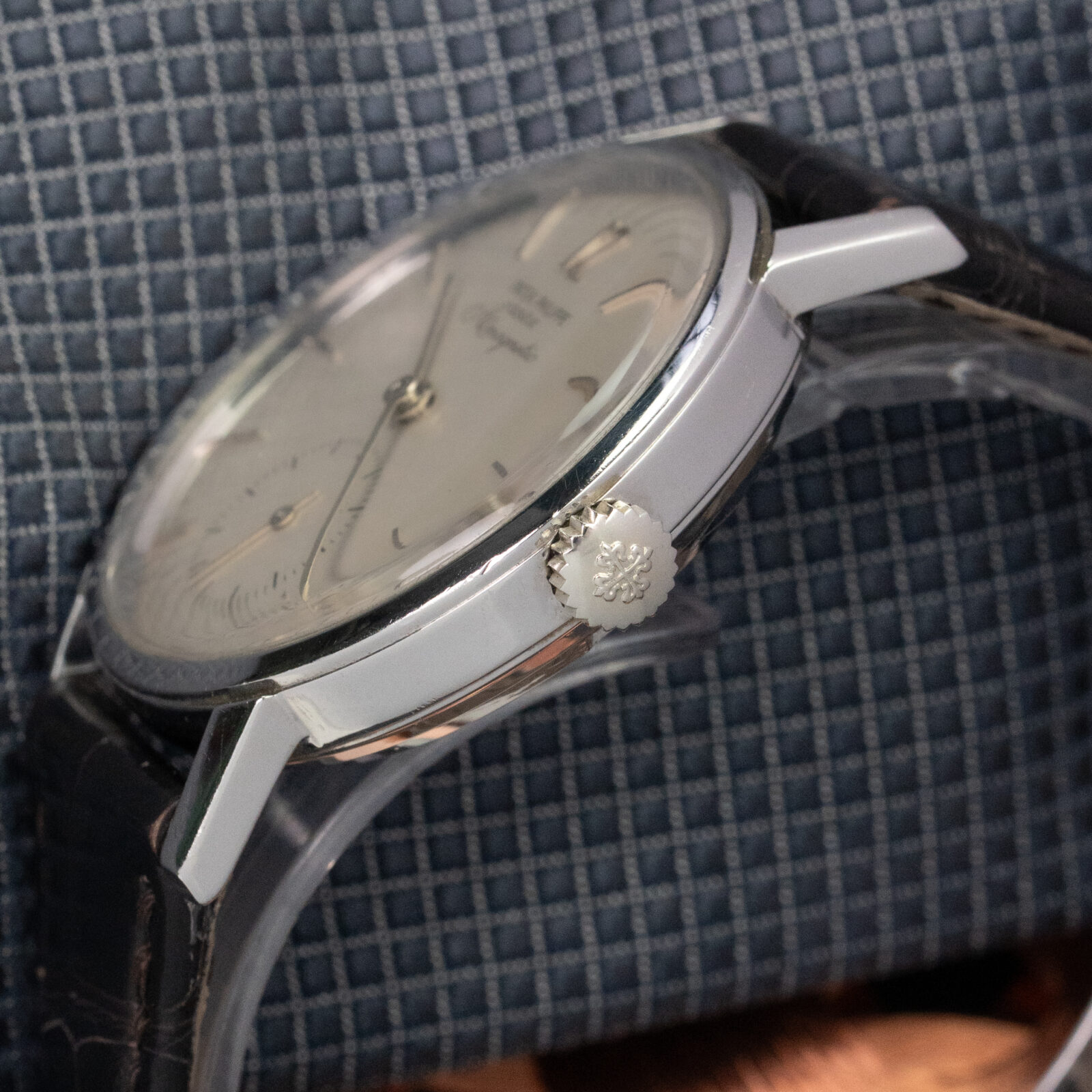 We are very happy to have this very strong example from the 4th series. It retains a sharp case and clean dial. According to the vintage extract it dates back to 1962. It comes on a dark Patek Philippe crocodile strap and has the original buckle.