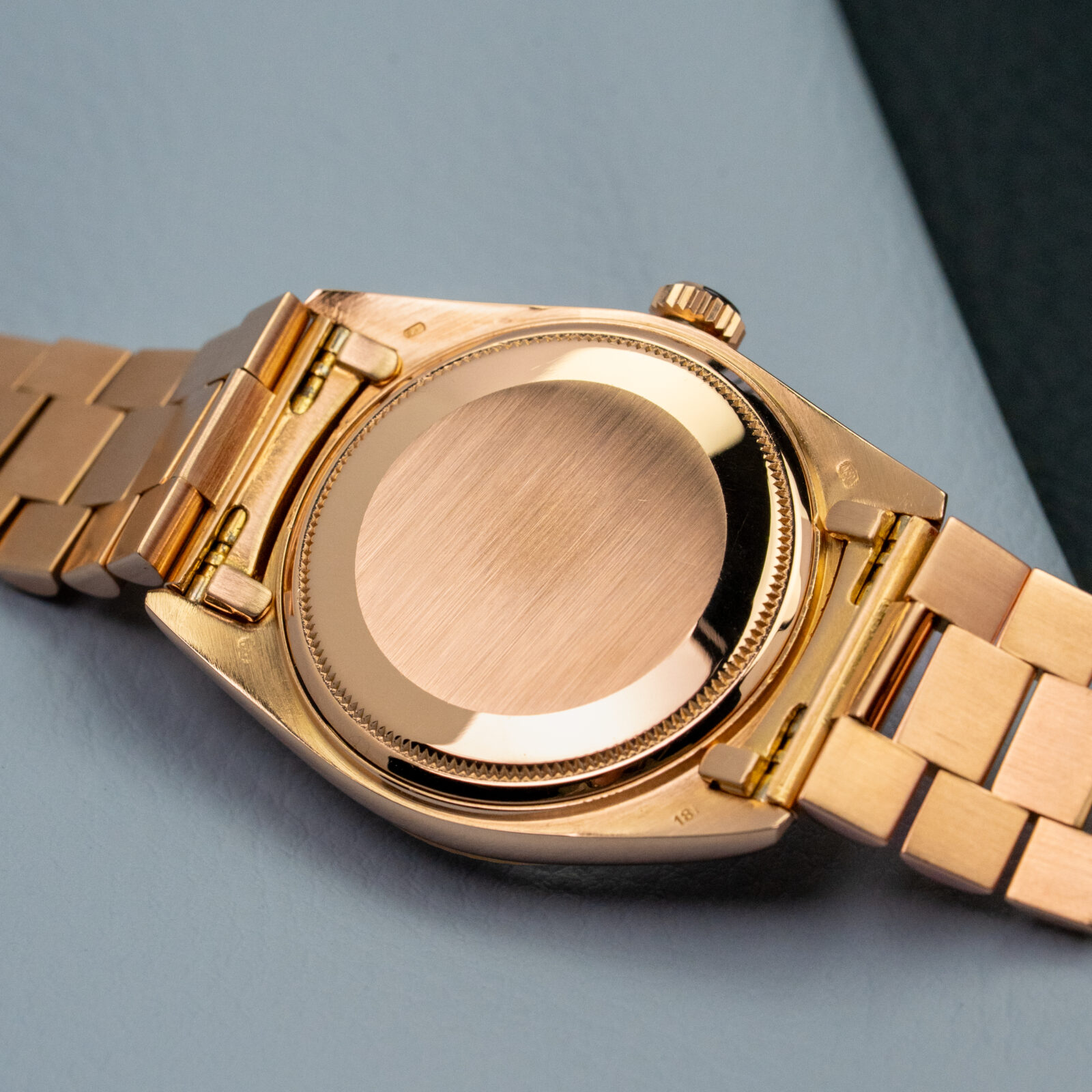 We’re thrilled to offer this spectacular Rolex Day-Date reference 1803, executed in 18k rose gold, dating back to 1977. While yellow gold might be the iconic Day-Date metal, rose gold examples are considerably rarer.