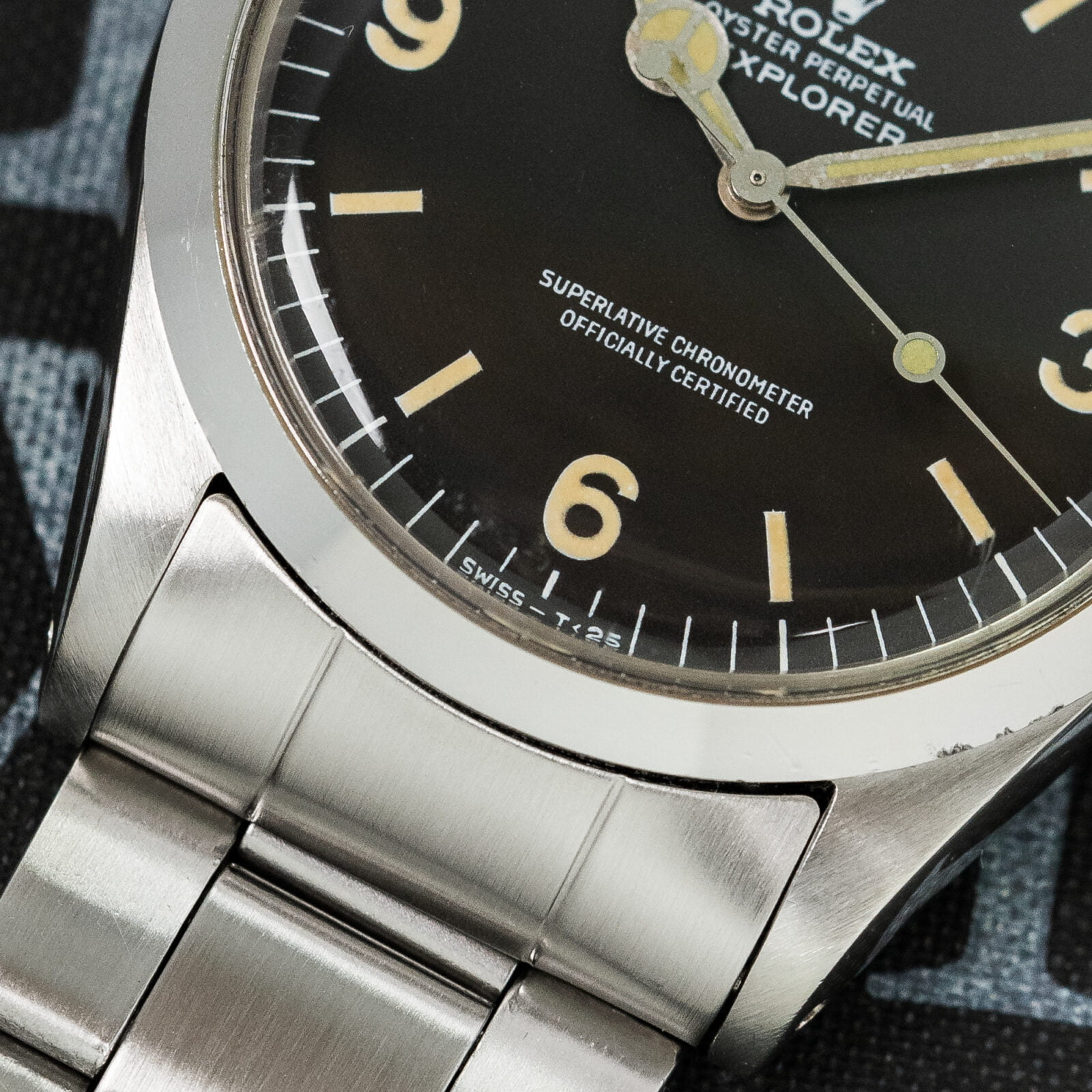 The ref. 1016 Explorer was introduced in 1959 and was produced for an impressive 30 years, making it one of Rolex’ longest-running references. In the first few years, Explorers featured glossy-black dials. Around 1967/1968 Rolex began using matte-black dials with a slightly grainy texture. The earliest of these matte (MK I) dials featured a Rolex coronet that resembled the foot of a frog, hence the nickname ‘Frog Foot’ dials.