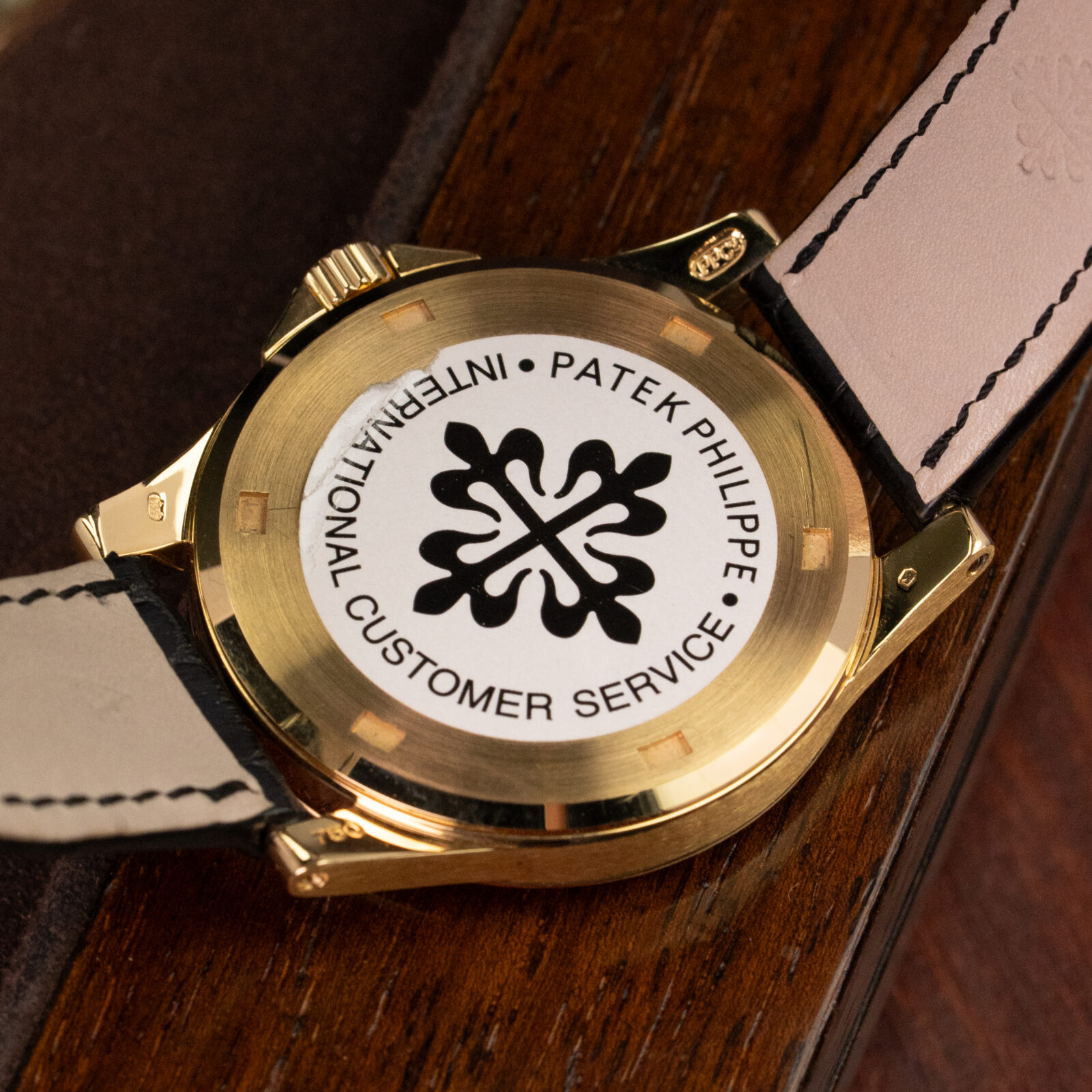 The upside, of course, is that the Neptune can still be picked up for a reasonable price while prices of the Aquanaut have gone through the roof in recent years. This reference 5081J from 2001 features a 36.5 mm yellow-gold case and a contrasting nlack dial. The dial sports a closed painted minute track in the centre with 5 minute indications on the outside and large applied 18k yellow-gold Roman numerals at the quarter positions. The dial’s elegant looks are complemented by large leaf hands and a discrete date window at the 3 o’clock position. The watch runs on a handy automatic movement and comes on a black alligator-leather Patek Philippe strap with a special 18k yellow-gold folding clasp that mimics the look of the bezel. The watch comes with recent Patek service papers and extract of the archives.