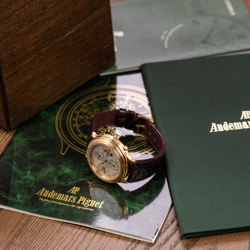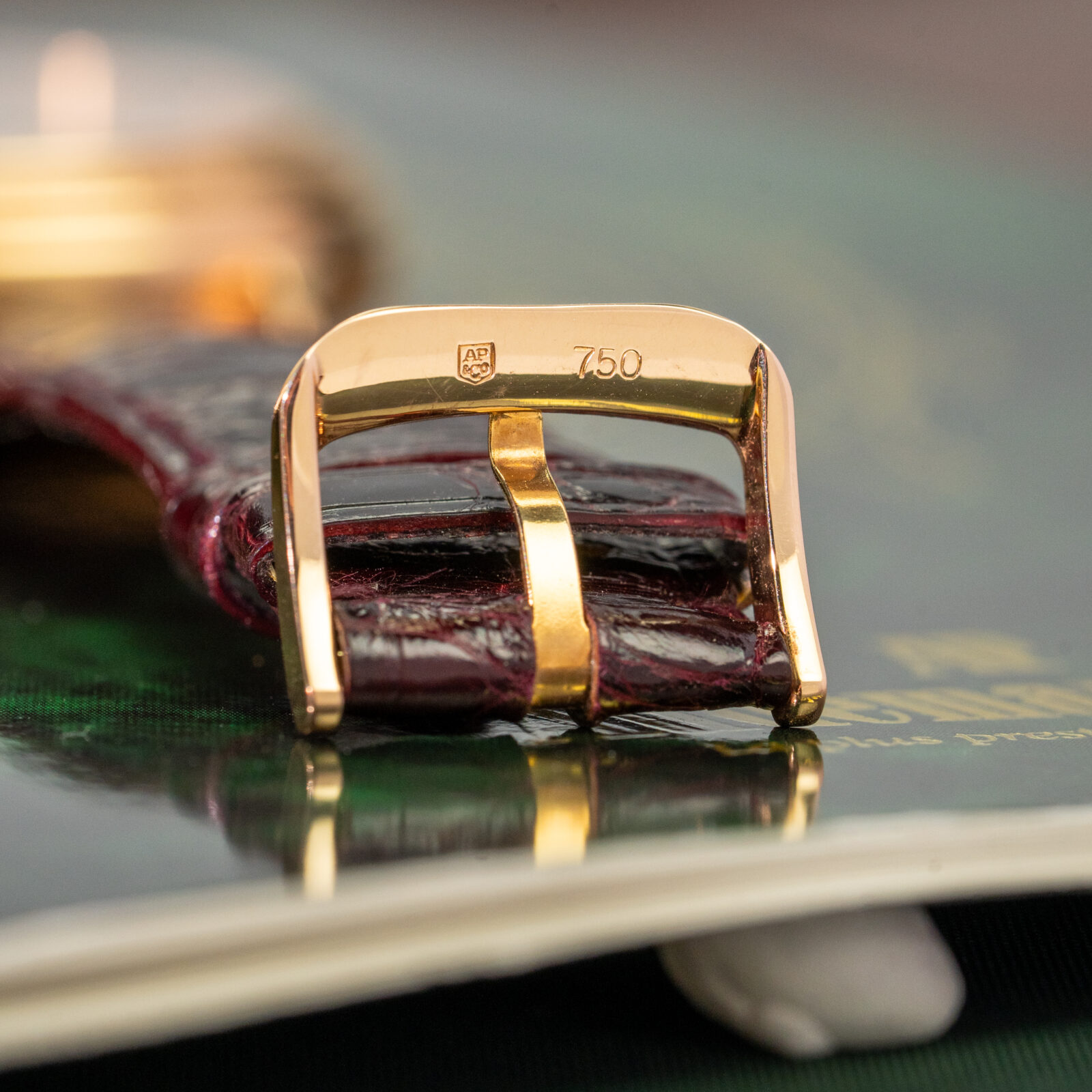 This 25695OR dates back to 1993 and comes as a full set with the papers booklets, and the original wooden box, which doubles as a winder for the automatic movement. The watch is delivered on a burgundy alligator-leather Audemars Piguet strap with an 18k rose-gold “AP”-signed Ardillon buckle.