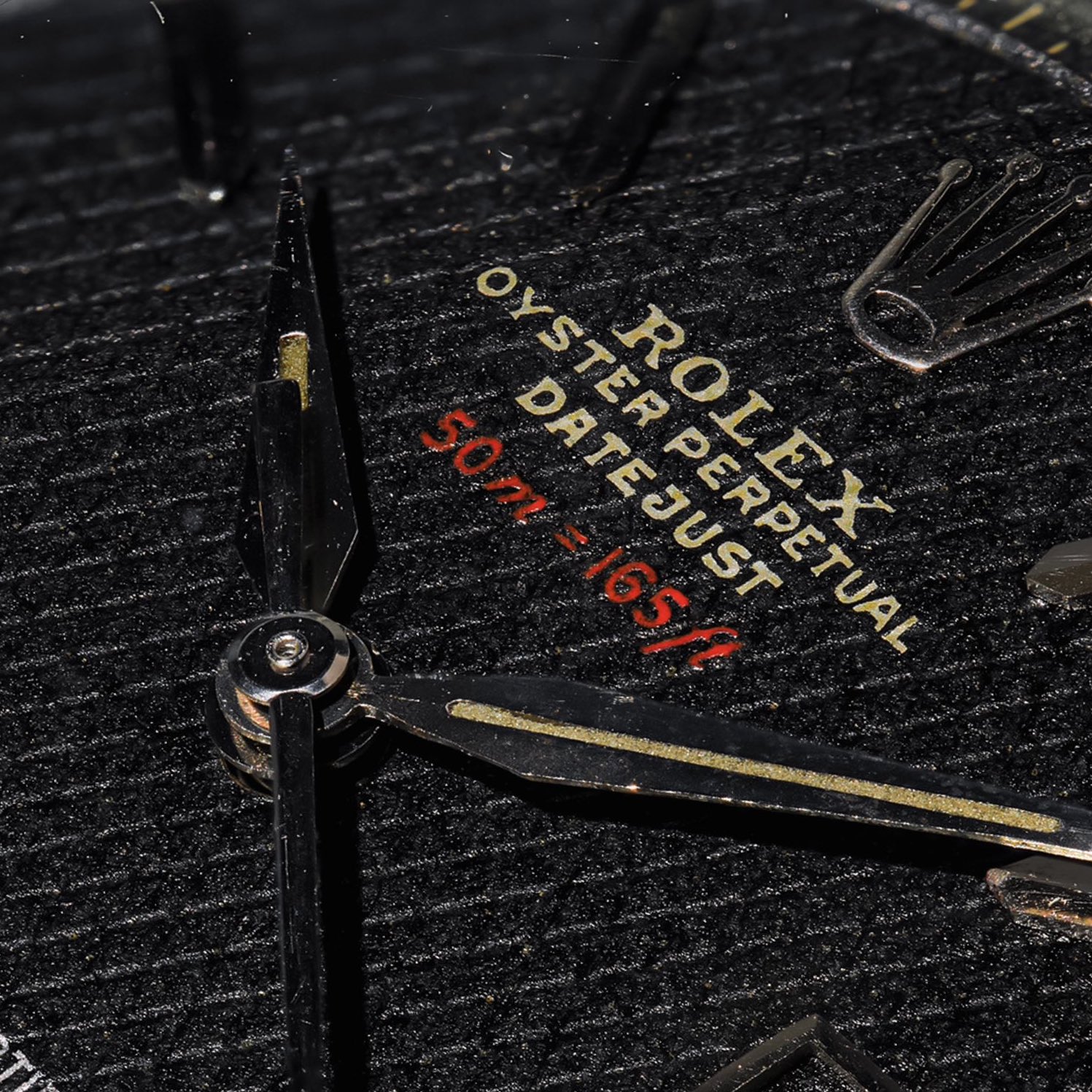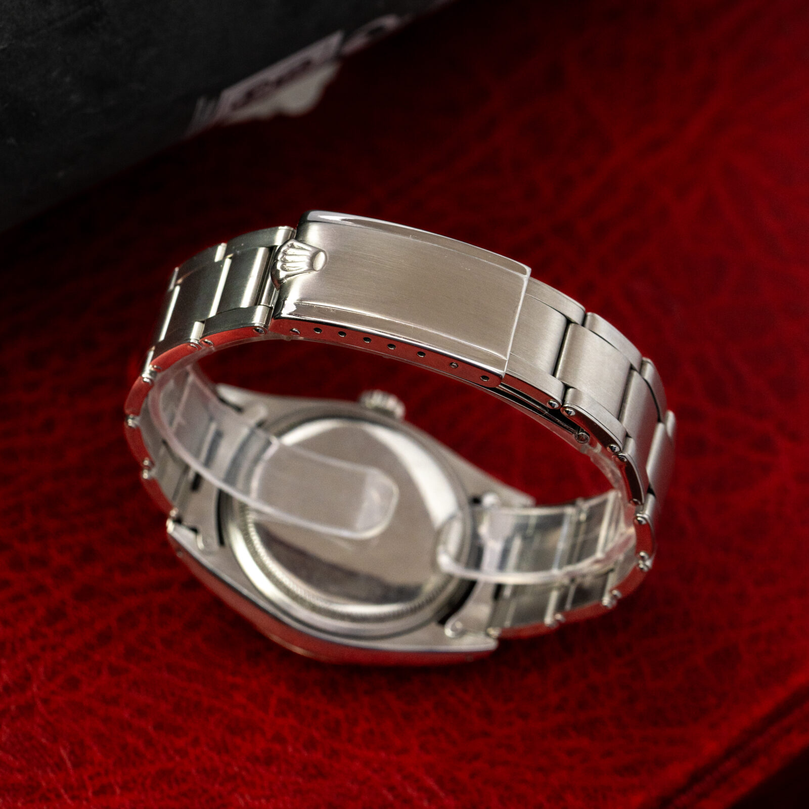Installed is the most coveted type of dial, which isn’t one with a smooth surface but with a waffle motif instead; also known as “Honeycomb”. These are considered the pinnacle of steel Rolex Datejusts. Apart from the two color options, either white or this more sought-after black dial, there is also a variety in the cliché used. Besides the spacing and graphics of the font, the clearest difference can be found in the smooth outer track that has a soft “pie-pan” edge. (less angular compared to the 16xx series) One being divided into 5 segments per minute, this one into 10 segments per 5 minutes.