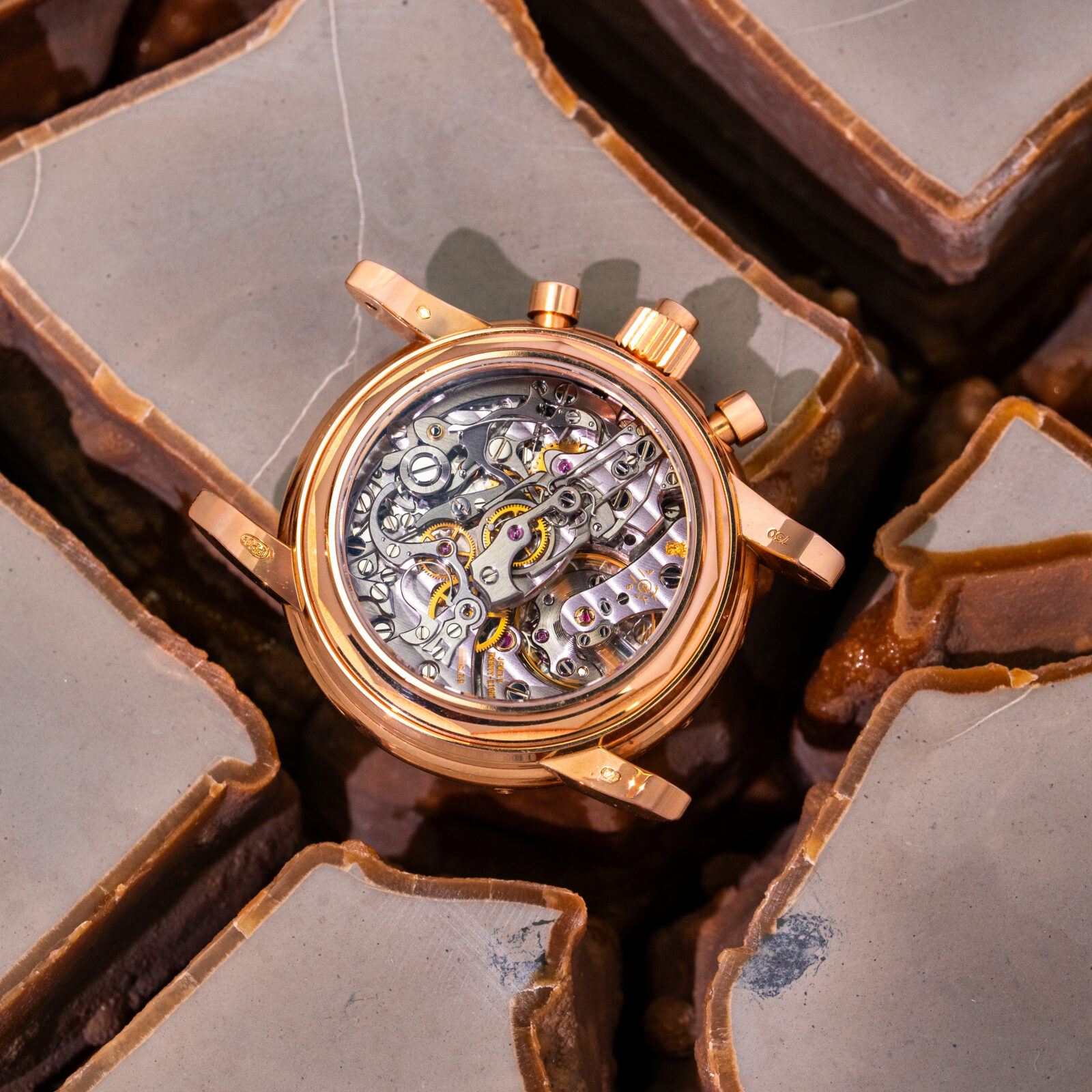 On the right hand-side of the case, the crown with integrated split-seconds button is sandwiched between two pump chronograph pushers. As the watch is turned upside down, the display case back gives way to the exquisite hand-finished in-house manual winding split-seconds caliber.