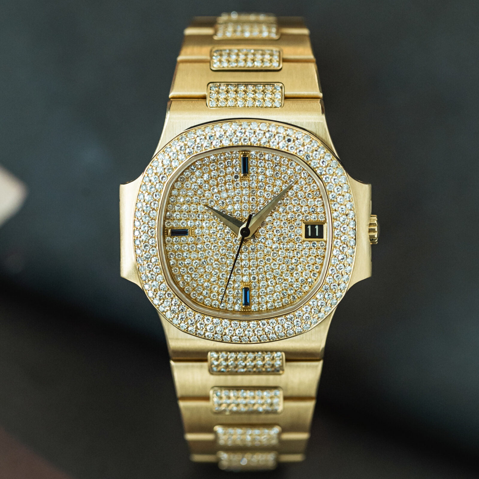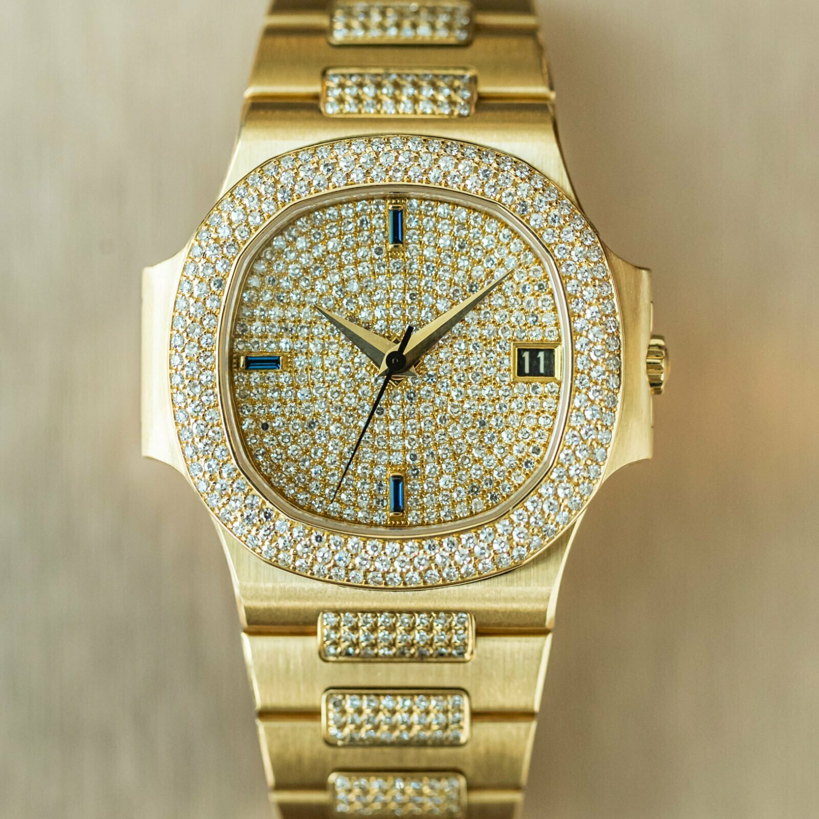 The ref. 3800/10x subseries of the mid-size Nautilus features exquisite gem-set models. Reference /105 is characterised by a 3-row diamond bezel and diamonds in the centrelink of the bracelet. features. Out of only a handful -of this execution- publicly known, only 3 have a fully pave-set dial. The quarters are set with baguette sapphires, bringing perfect balance to the dial, alongside the blue date at 3 o'clock. Meanwhile, the broad faceted dauphine hands inject the watch with a hint of 1950s elegance.