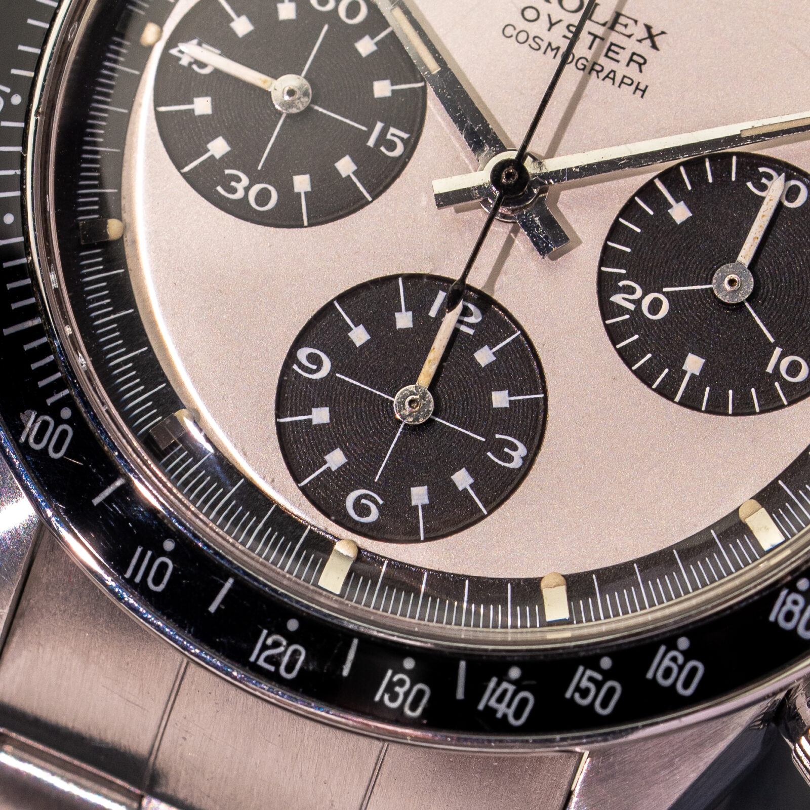 The iconic ‘Paul Newman’ dial on this watch is executed in the ‘panda’ configuration with a white background and black sub-registers. A few characteristics make the dial configuration so loved among collectors, including the contrasting recessed outer seconds track, the square applied hour markers, and the iconic sub-registers with Art Deco font and square hash marks. This dial is the very first execution, a so-called Mark 1 dial, recognizable due to its ‘old-style’ Rolex logo, big 'R' in Rolex, and non-serif ‘Oyster’ and ‘Cosmograph’ text.