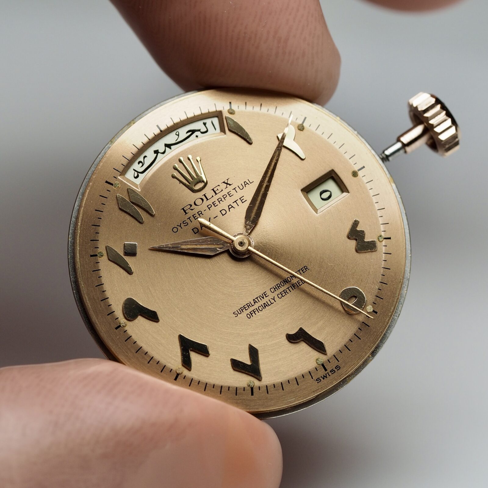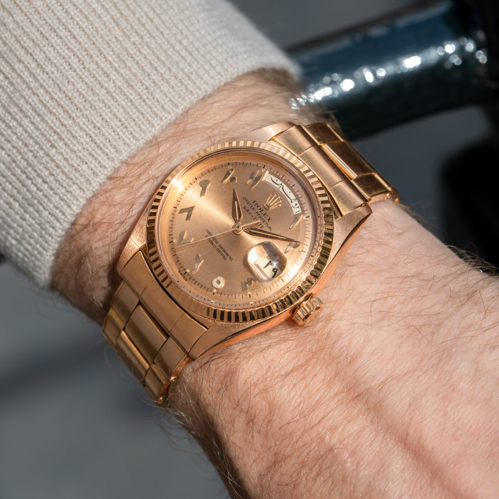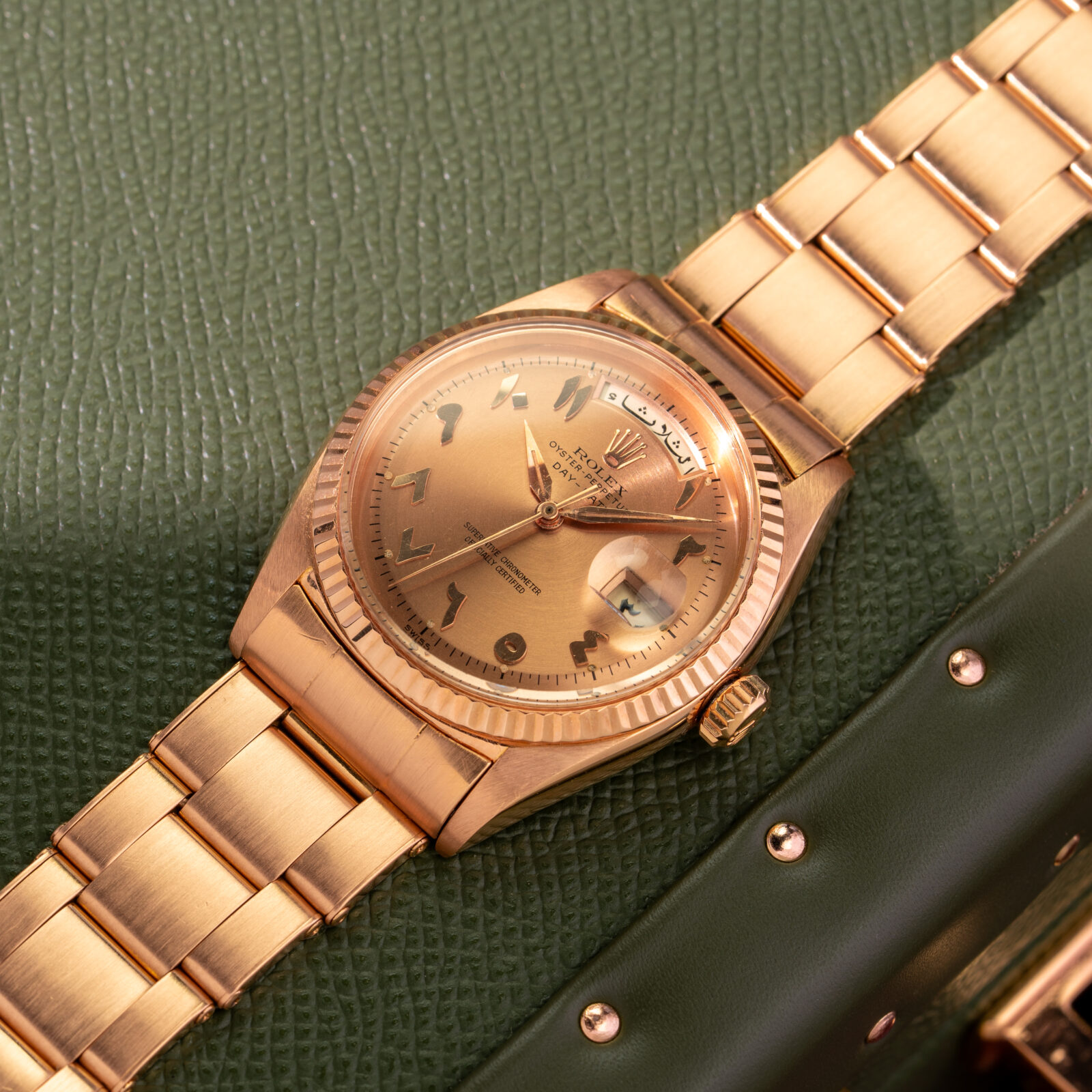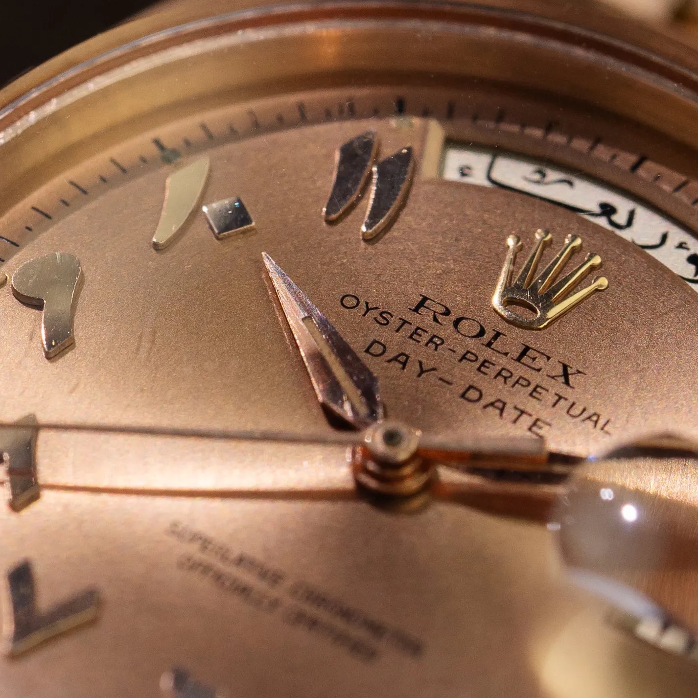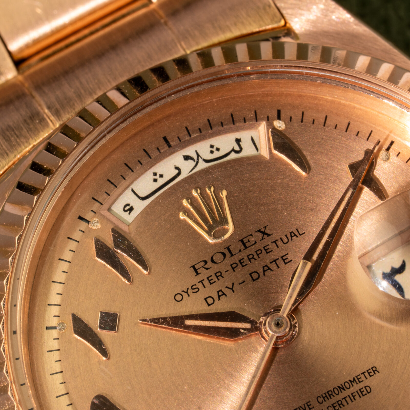 This exceptional iteration is truly one of the most desirable Day-Dates ever made. What makes it so special? Starting with the concentric circles on the dial, something you only see in the 60's. This rosé surface results in a spectacular look, especially then you play with the light a bit. This text lay-out, with the model name lower and a more stylised font, is only to be found in very early 18xx and late 66xx series; just like the leaf-shaped hands. To make it more special, Rolex applied 18k rose gold Eastern Arabic indices and matching Arabic day and date discs. Additionally it sports luminous plots, most of which are still in tact.